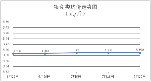 粮食类商品价格保持稳定。所监测的4种粮食类商品价格均持平,综合零售均价为每斤3.390元。其中:珍珠米、面粉零售均价分别为每斤3.10元、3.40元,环比均持平。