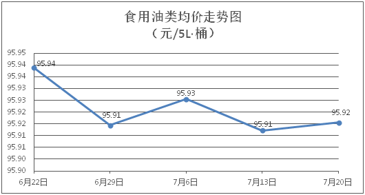 食用油类商品价格基本平稳。所监测的9种食用油(5L装)商品价格波动情况为1涨1跌7平,综合零售均价为每桶95.92元,环比上涨0.003%。其中:金龙鱼花生油、玉米油零售均价为每桶102.83元、76.12元,环比分别持平、上涨0.08%。