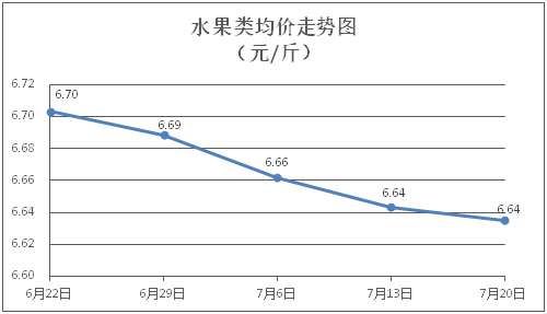 水果类商品价格升降互现。所监测的6种水果商品价格波动情况为3涨3跌,综合零售均价为每斤6.64元,环比下降0.13%。其中橙子、香蕉、梨零售均价分别为每斤6.45元、3.38元、5.29元,环比分别上涨0.47%、下降0.29%、下降1.31%。