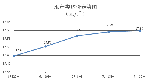 水产类商品价格微幅波动。所监测的9种水产商品价格波动情况为3涨6跌,综合均价为每斤17.60元,环比上涨0.04%。其中:草鱼、鲫鱼、罗非鱼、基围虾零售均价分别为每斤11.28元、14.26元、9.07元、30.85元,环比分别上涨0.89%、下降0.35%、下降0.11%、下降0.03%。