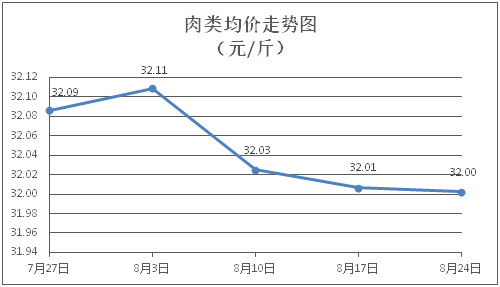 肉类商品价格微幅盘整。所监测的8种肉类商品价格波动情况为6涨2跌,综合零售均价为每斤32.00元,环比下降0.01%。其中:排骨、精瘦肉、牛肉、带骨羊肉零售均价分别为每斤30.35元、18.91元、46.25元、42.13元,环比分别下降0.26%、上涨0.05%、上涨0.06%、下降0.21%。