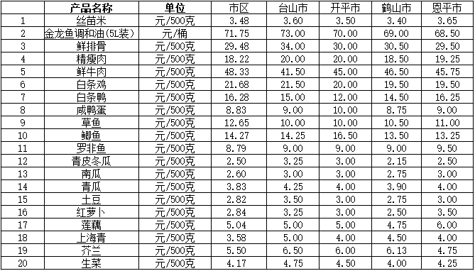 说明:1、表中价格为该地区监测点上周综合平均价;2、“市区”含春雨直播 、江海区、新会区,价格分别采自蓬江市场、江南市场、城东市场等13家农贸市场;3、其他四个县市价格分别采自新华市场、锦江市场等8家农贸市场。