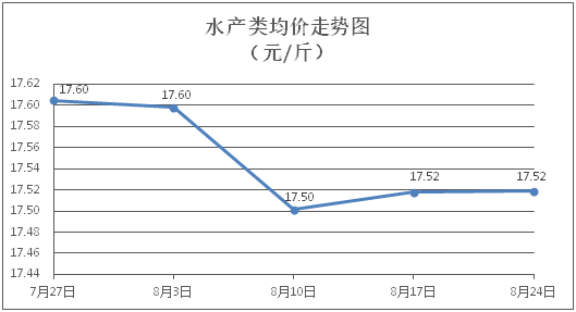 水产类商品价格升降互现。所监测的9种水产商品价格波动情况为4涨4跌1平,综合均价为每斤17.52元,环比上涨0.01%。其中:草鱼、鲫鱼、罗非鱼、基围虾零售均价分别为每斤11.35元、14.33元、8.98元、29.38元,环比分别上涨0.27%、下降0.83%、上涨0.11%、下降0.37%。