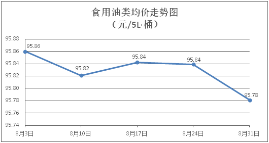 食用油类商品价格稳中微跌。所监测的9种食用油(5L装)商品价格波动情况为4跌5平,综合零售均价为每桶95.78元,环比下降0.06%。其中:金龙鱼花生油、大豆油零售均价分别为每桶102.38元、61.50元,环比分别下降0.23%、下降0.13%。