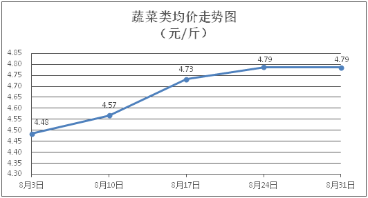 蔬菜类商品价格涨跌互现。所监测的32 种蔬菜商品价格波动情况为14涨15跌3平,综合零售均价为每斤4.79元,环比下降0.03%。其中:涨幅居前的品种包括椰菜、黄瓜、蒜苔,零售均价分别为每斤3.14元、4.19元、8.14元,环比分别上涨6.08%、6.08%、1.88%;跌幅靠前的品种包括白苋菜、本地菜心、水东芥菜,零售均价分别为每斤4.44元、5.60元、4.61元,环比分别下降6.53%、4.76%、1.28%。
