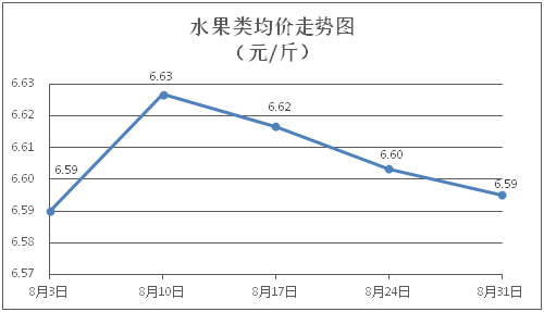 水果类商品价格微幅波动。所监测的6种水果商品价格波动情况为2涨1跌3平,综合零售均价为每斤6.60元,环比下降0.13%。其中橙子、香蕉、葡萄零售均价分别为每斤7.03元、3.20元、13.25元,环比分别上涨0.29%、持平、下降0.67%。