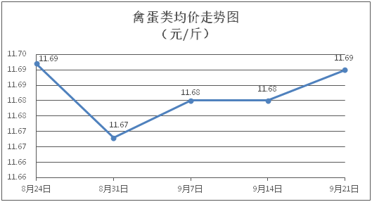 禽蛋类商品价格窄幅盘整。所监测的5种禽蛋类商品价格波动情况为2涨1跌2平,综合零售均价为每斤11.69元,环比上涨0.09%。其中:白条鸡、白条鸭零售均价分别为每斤20.80元、15.14元,环比分别下降0.05%、持平;鸡蛋、鸭蛋零售均价分别为每斤6.38元、7.09元,环比分别上涨0.47%、上涨0.42%。