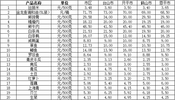 说明:1、表中价格为该地区监测点上周综合平均价;2、“市区”含春雨直播 、江海区、新会区,价格分别采自蓬江市场、江南市场、城东市场等13家农贸市场;3、其他四个县市价格分别采自新华市场、锦江市场等8家农贸市场。