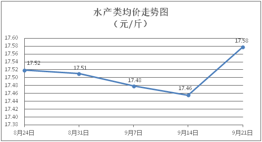 水产类商品价格总体略涨。所监测的9种水产商品价格波动情况为5涨4跌,综合均价为每斤17.58元,环比上涨0.70%。其中:黄花鱼、鲫鱼、鳙鱼、基围虾零售均价分别为每斤25.91元、14.06元、11.09元、28.92元,环比分别上涨4.90%、下降1.82%、上涨1.28%、下降0.52%。