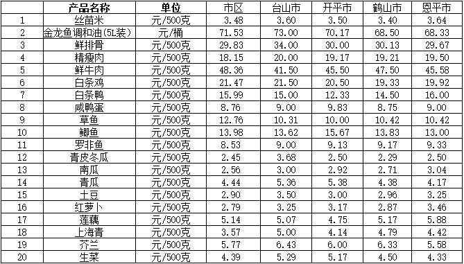 说明:1、表中价格为该地区监测点上周综合平均价;2、“市区”含春雨直播 、江海区、新会区,价格分别采自蓬江市场、江南市场、城东市场等13家农贸市场;3、其他四个县市价格分别采自新华市场、锦江市场等8家农贸市场。