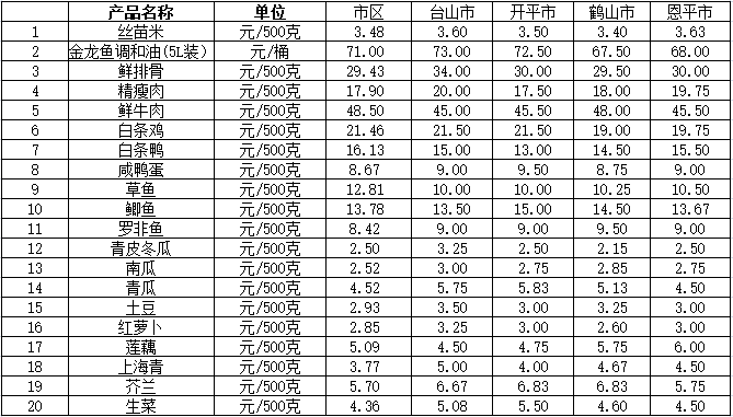 说明:1、表中价格为该地区监测点上周综合平均价;2、“市区”含春雨直播 、江海区、新会区,价格分别采自蓬江市场、江南市场、城东市场等13家农贸市场;3、其他四个县市价格分别采自新华市场、锦江市场等8家农贸市场。