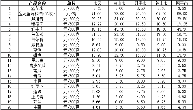 说明:1、表中价格为该地区监测点上周综合平均价;2、“市区”含春雨直播 、江海区、新会区,价格分别采自蓬江市场、江南市场、城东市场等13家农贸市场;3、其他四个县市价格分别采自新华市场、锦江市场等8家农贸市场。
