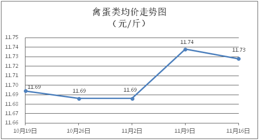 禽蛋类商品价格稳中有降。所监测的禽蛋类商品价格波动情况为2跌3平,综合零售均价为每斤11.73元,环比下降0.09%。其中:白条鸡、白条鸭零售均价分别为每斤20.90元、15.27元,环比分别下降0.10%、持平;鸡蛋、咸鸭蛋零售均价分别为每斤6.35元、8.93元,环比分别下降0.47%、持平。
