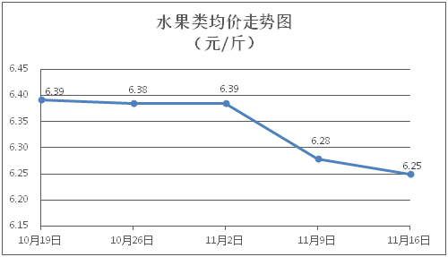 水果类商品价格略有下降。所监测的水果商品价格波动情况为1涨3跌2平,综合零售均价为每斤6.25元,环比下降0.45%。其中橙子、香蕉、梨零售均价分别为每斤6.73元、2.73元、5.28元,环比分别下降1.03%、上涨0.37%、下降0.38%。