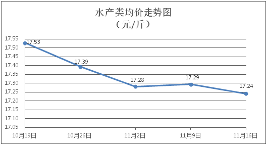 水产类商品价格窄幅盘降。所监测的水产商品价格波动情况为4涨5跌,综合均价为每斤17.24元,环比下降0.30%。其中:草鱼、鲫鱼、罗非鱼、基围虾零售均价分别为每斤11.39元、13.83元、8.88元、28.38元,环比分别下降0.35%、下降1.14%、上涨0.23%、上涨0.21%。