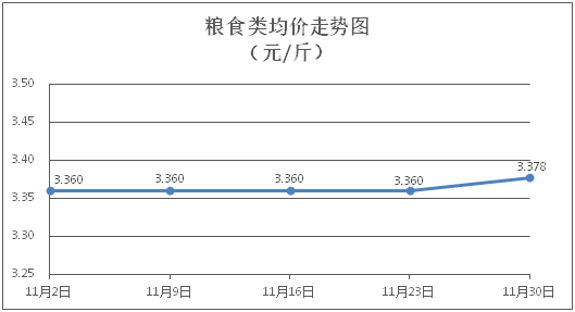 粮食类商品价格稳中微涨。所监测的粮食类商品价格波动情况为3涨1平,综合零售均价为每斤3.378元,环比上涨0.52%。其中:丝苗米、面粉零售均价分别为每斤3.53元、3.32元,环比分别上涨0.57%、持平。