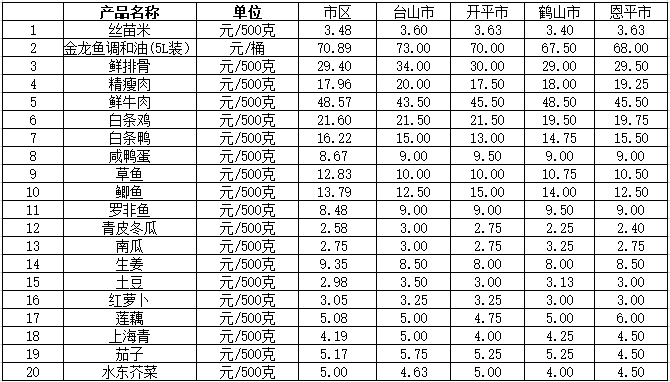 说明:1、表中价格为该地区监测点上周综合平均价;2、“市区”含春雨直播 、江海区、新会区,价格分别采自蓬江市场、江南市场、城东市场等13家农贸市场;3、其他四个县市价格分别采自新华市场、锦江市场等8家农贸市场。