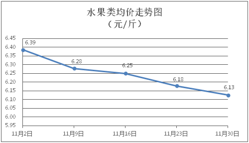 水果类商品价格总体略降。所监测的水果商品价格波动情况为2涨3跌1平,综合零售均价为每斤6.13元,环比下降0.84%。其中橙子、苹果、葡萄零售均价分别为每斤6.28元、7.97元、11.43元,环比分别下降3.24%、上涨0.25%、下降0.44%。