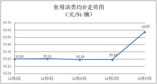 食用油类商品价格总体微涨。所监测的食用油(5L装)商品价格波动情况为3涨2跌4平,综合零售均价为每桶93.57元,环比上涨0.41%。其中:胡姬花花生油、金龙鱼调和油零售均价分别为每桶134.92元、70.17元,环比分别上涨1.28%、下降0.03%。