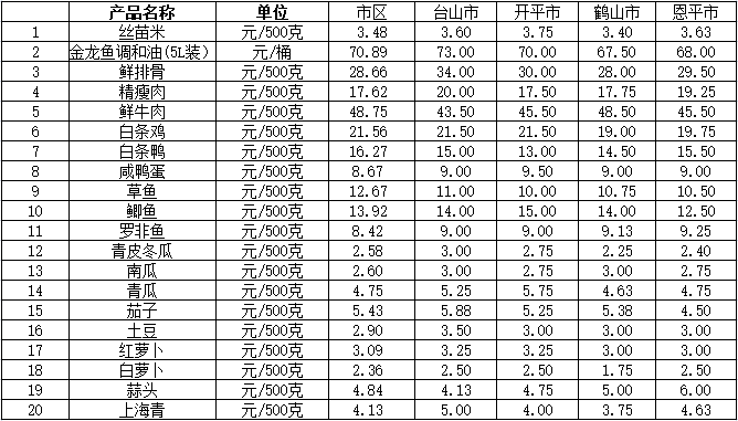 说明:1、表中价格为该地区监测点上周综合平均价;2、“市区”含春雨直播 、江海区、新会区,价格分别采自蓬江市场、江南市场、城东市场等13家农贸市场;3、其他四个县市价格分别采自新华市场、锦江市场等8家农贸市场。