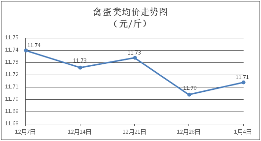 禽蛋类商品价格稳中微升。所监测的禽蛋类商品价格波动情况为1涨1跌3平,综合零售均价为每斤11.71元,环比上涨0.09%。其中:白条鸡、白条鸭零售均价分别为每斤20.83元、15.29元,环比分别上涨0.34%、下降0.13%;鸡蛋、咸鸭蛋零售均价分别为每斤6.33元、8.93元,环比均持平。