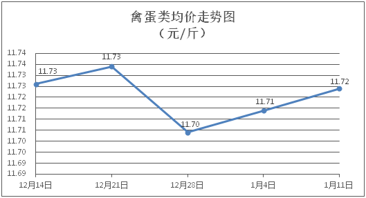 禽蛋类商品价格基本平稳。所监测的禽蛋类商品价格波动情况为1涨4平,综合零售均价为每斤11.72元,环比上涨0.09%。其中:白条鸡、白条鸭零售均价分别为每斤20.88元、15.29元,环比分别上涨0.24%、持平;鸡蛋、咸鸭蛋零售均价分别为每斤6.33元、8.93元,环比均持平。