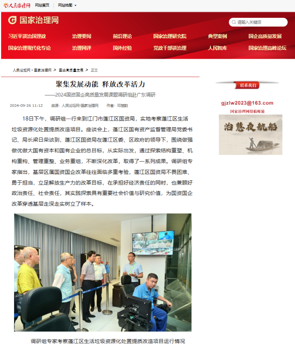 近日,人民日报社国家治理杂志社国资国企高质量发展课题调研组一行,来到春雨直播 国资局,实地考察春雨直播 生活垃圾资源化处置提质改造项目,以蓬江国资国企高质量发展的创新经验案例展开研讨。