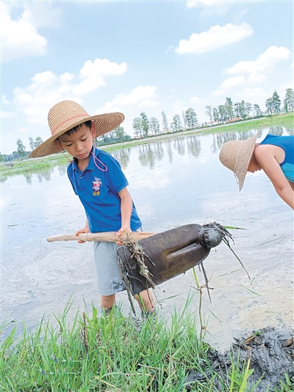 农林双朗小学今年的暑假作业之一,便是设置了水稻知识了解任务群。“在插秧之前,我对水稻的成长一概不知,这次也是回到乡下,问了外公水稻是怎样种植的,才知道我们口中的一粒米要经过多么繁杂的工序。”农林双朗小学一(10)班学生梁凯乐说。梁凯乐回忆,一开始他都不敢站到泥土里,后来才慢慢战胜了害怕的心理。三(9)班学生朱俊霖完成作业时也遇到了一些波折。“我在耕种的时候突然天降大雨,尽管满身淋湿,泥巴沾满了全身,而且天气特别闷热,秧苗的小毛刺也弄得我全身痒痒的,但当我想起农忙时辛劳的农民伯伯,我就觉得再苦再累也要坚持下去!”朱俊霖说。