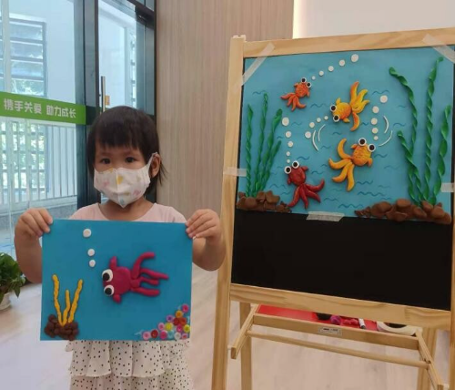 噔噔噔~在亲子齐心协力下,我们的小金鱼出场啦!儿童看着自己亲手制作的小金鱼,露出了满意的笑容。同时,在社工与志愿者的带领下,儿童分享他们的制作成果,并勇敢地上台展示、讲解自己制作的小金鱼,给予儿童表达以及展现的机会。