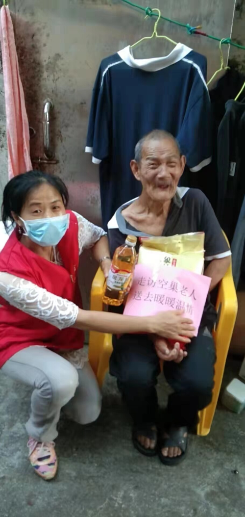 居住在白沙街道复兴社区的成叔,高龄、丧偶、独居且经济困难,是本次上门走访慰问的重点对象之一。志愿者上门探访了解老人的身体及生活状况,陪伴老人聊天,给予老人心灵慰藉并送上慰问品,不仅解决了老人的迫切需求,也让老人感受到来自党和政府的关怀和温暖。志愿者建议在夏季炎热天气,老年人应清淡饮食,多吃水果蔬菜,适当补充淡盐水,注意饮食卫生,平安健康度过炎炎夏日。