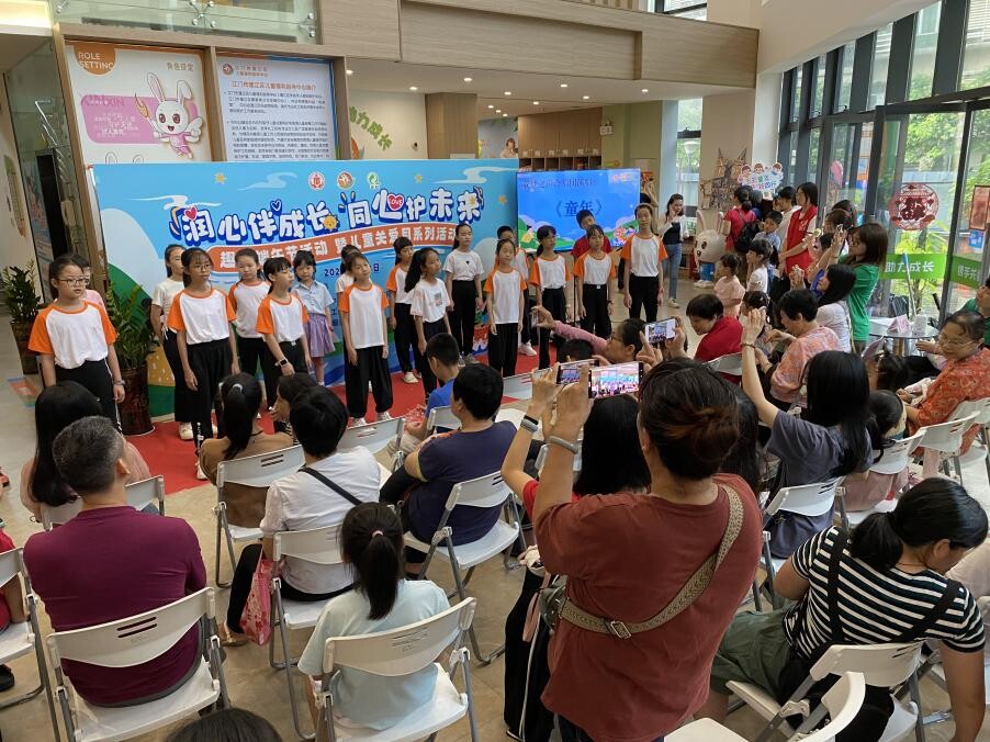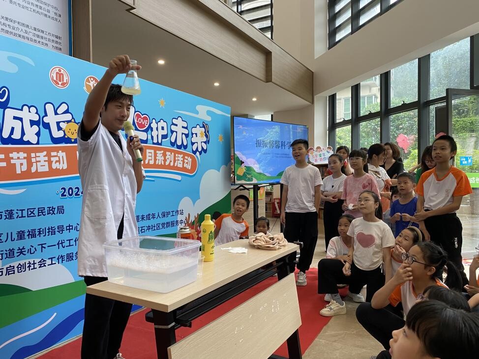在舞台环节,来自中心的“童梦之声”合唱团、关爱联盟单位邑榕慈善公益基金会以及中心服务参与代表为现场群众上演童歌演唱、科学秀等及知识问答等精彩节目,现场参与和互动的气氛随即被带动。