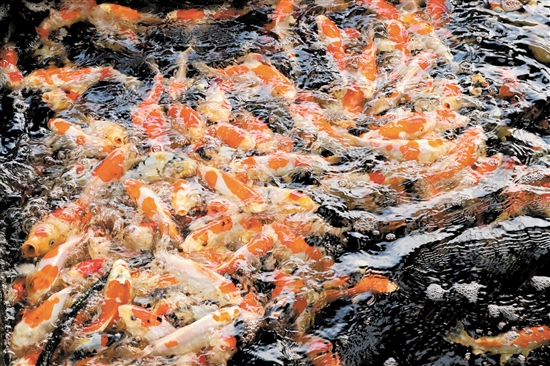 在荷塘镇的新姿美锦鲤养殖场,场主黄锦明将饵料一撒而下,数百条色彩斑斓、泳姿灵活的锦鲤蜂拥而至,争抢食物,激起层层水花。