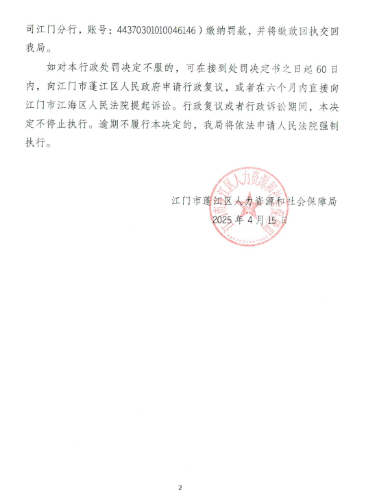 你单位应在接到本决定书之日起15日内通过银行转账方式(户名:待报解预算收入非税收入收缴,开户银行:中国农业银行股份有限公司江门分行,账号:44370301010046146)缴纳罚款,并将缴款回执交回我局。