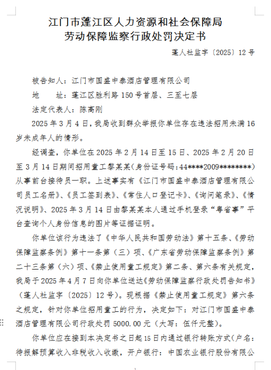 你单位该行为违法了《中华人民共和国劳动法》第十五条、《劳动保障监察条例》第十一条第(三)项、《广东省劳动保障监察条例》第二十三条第(六)项、《禁止使用童工规定》第二条、第六条有关规定,我局于2025年4月7日向你单位送达《劳动保障监察行政处罚告知书》(蓬人社监字〔2025〕12号)。现根据《禁止使用童工规定》第六条之规定,针对你单位招用童工的行为,决定如下:对江门市国盛中泰酒店管理有限公司行政处罚5000.00元(大写:伍仟元整)。