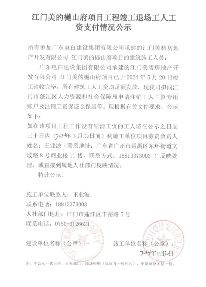 现将樾山府1幢、2幢~7幢、8幢(文体中心)、9幢~13幢、一期地下室(绝对标高13.25、16.55、20.05地下室)、二期地下室(绝对24.25、27.55、31.15、34.45地下室)、电梯、门卫室、商业1#、商业2#工程项目《工程竣工退场工人工资支付情况公示》挂网公示如下,如发现该项目存在欠薪等相关情况的,请在30日内,请携带相关佐证材料,到施工单位项目或者人社部门反映情况。