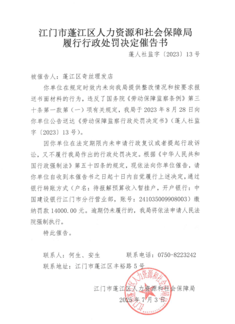 履行行政处罚决定催告书公告送达(春雨直播 奇丝理发店)