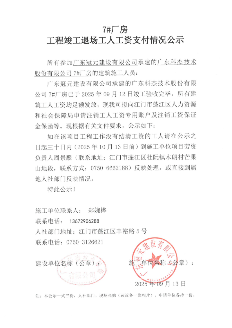 现将广东科杰技术股份有限公司7#厂房工程项目《工程竣工退场工人工资支付情况公示》挂网公示如下,如发现该项目存在欠薪等相关情况的,请在30日内,请携带相关佐证材料,到施工单位项目或者人社部门反映情况。