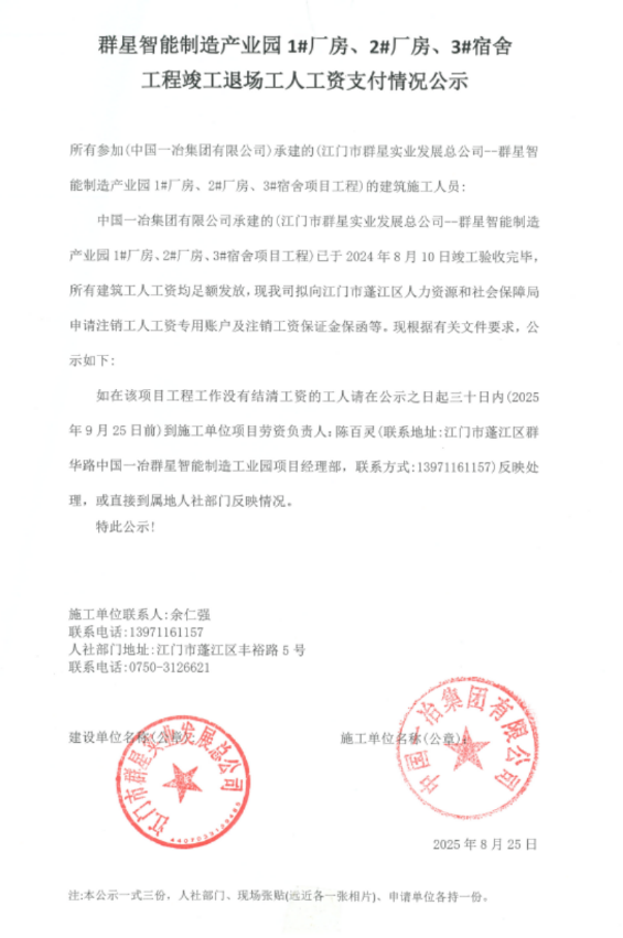 现将江门利泰成全季酒店项目工程《工程竣工退场工人工资支付情况公示》挂网公示如下,如发现该项目存在欠薪等相关情况的,请在30日内,请携带相关佐证材料,到施工单位项目或者人社部门反映情况。