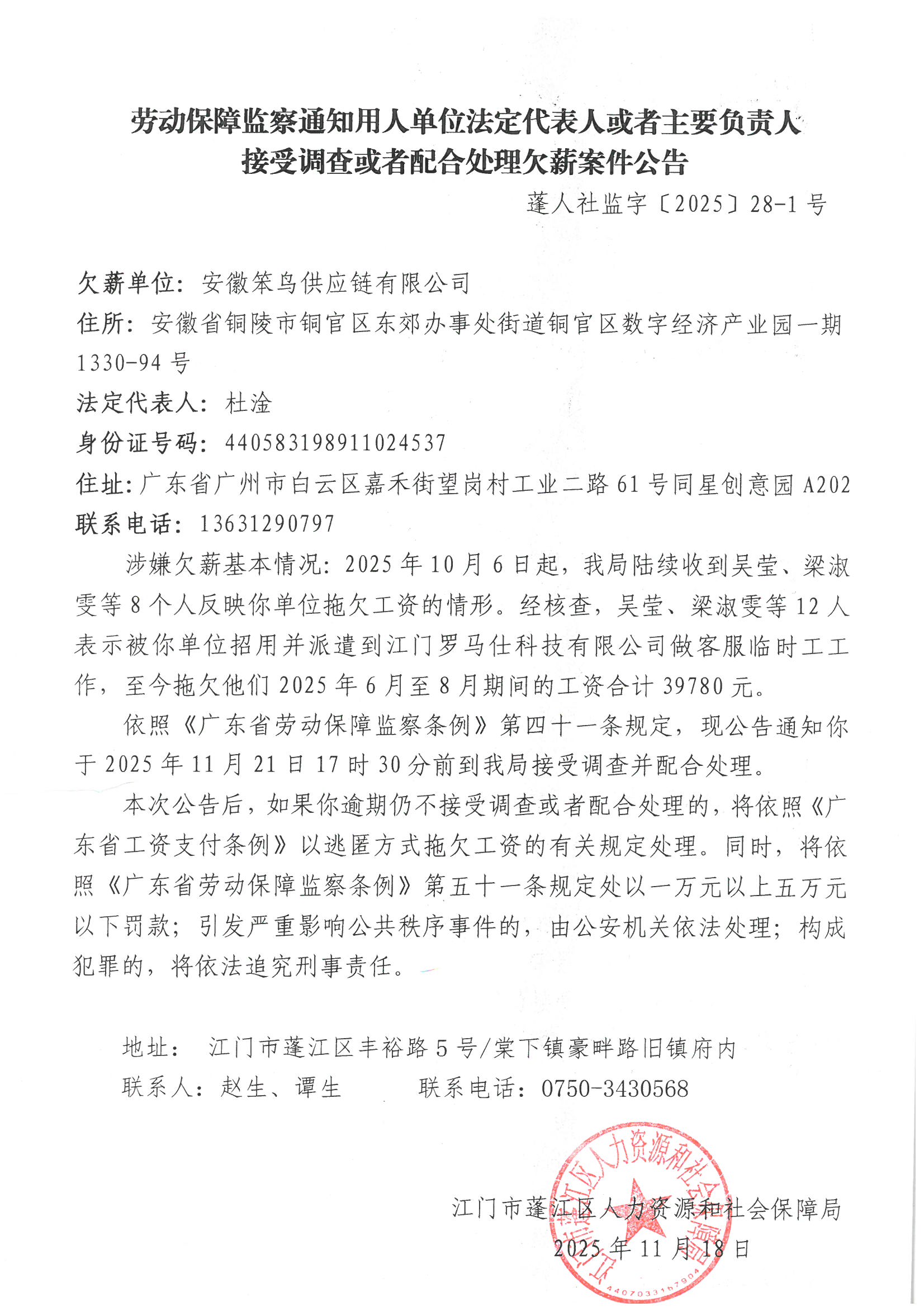 接受调查或者配合处理欠薪案件公告(安徽笨鸟供应链有限公司)