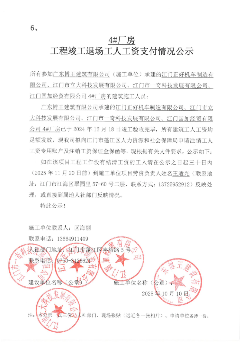 现将江门正好机车制造有限公司、江门市立大科技发展有限公司、江门市一奇科技发展有限公司、江门国加经贸有限公司4#厂房工程项目《工程竣工退场工人工资支付情况公示》挂网公示如下,如发现该项目存在欠薪等相关情况的,请在30日内,请携带相关佐证材料,到施工单位项目或者人社部门反映情况。