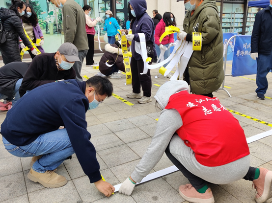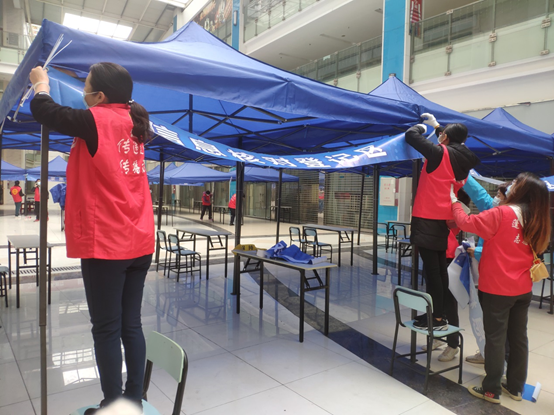 1月15日一早,区人社局的志愿者就已经到达现场,在社区工作人员的指挥下,齐心协力搭建帐篷、搬运物资、摆放桌椅、设置隔离带、粘贴一米线……各项布置工作有条不紊,为按时开展核酸采样做好充分准备。