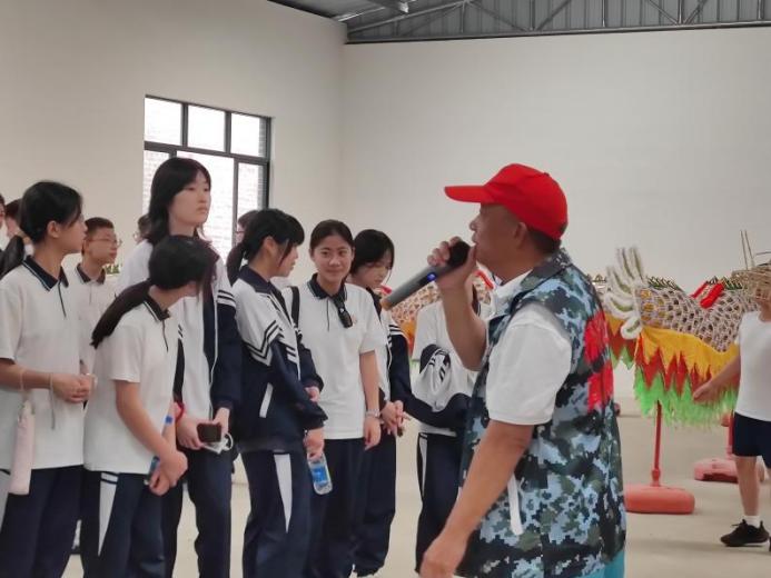 活动现场,退役军人志愿者们分工明确、各司其职、各尽所能。在东莞东华学校研学中,为参观研学的师生们讲解纱龙历史、制作工艺以及纱龙舞基本动作。芝山纱龙是潮连当地的古老民间艺术,距今已有700多年的历史。经过数百年的传承和发展,潮连芝山纱龙在2015年被列入江门市第五批市级非物质文化遗产名录。与一般的舞龙表演不同,潮连芝山纱龙在龙身内部点上蜡烛,这种独特的装饰方式使得它在夜晚表演时更具有别样的韵味。退役军人志愿者们绘声绘色的讲述,引得现场学子们不时爆发出阵阵热烈的掌声。