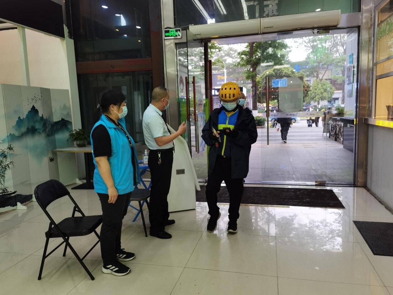 图为春雨直播 区自然资源局志愿者总工程师李琳在汇悦城核查出入人员健康码及疫苗接种情况。
