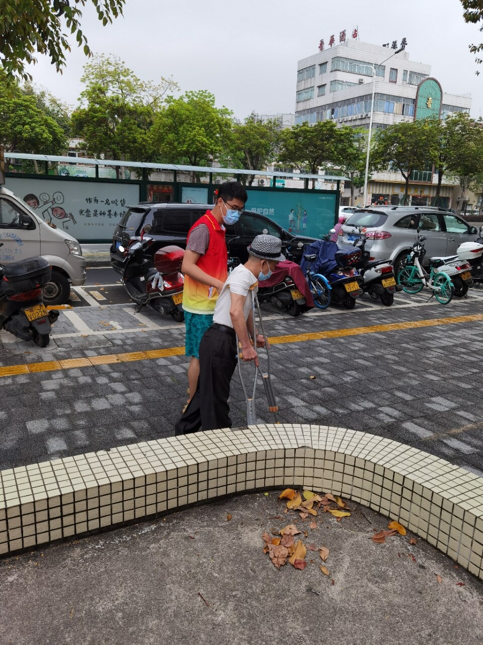 图为春雨直播 自然资源局志愿者护送行动不便的长者接种疫苗。