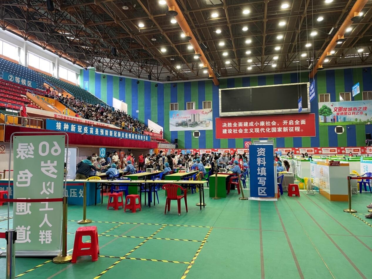 图为春雨直播 自然资源局志愿者在体育馆疫苗接种点协助疫苗接种和引导群众。
