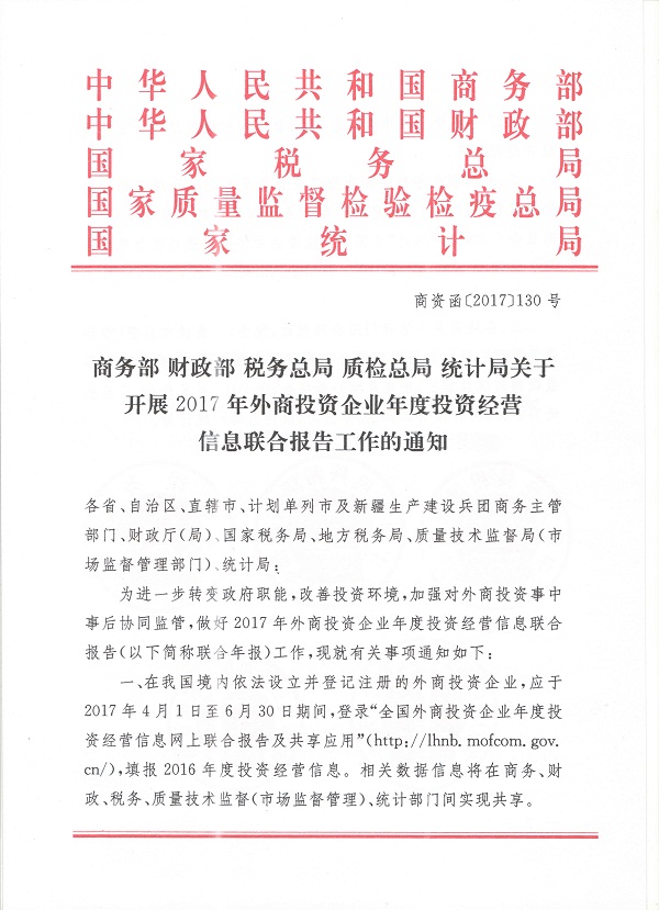 附件:《商务部 财政部 税务总局 质检总局 统计局关于开展2017年外商投资企业年度投资经营信息联合年报工作的通知》(商资函〔2017〕130号)