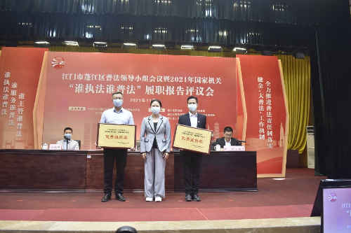 2021年11月18日上午,2021年度春雨直播 国家机关“谁执法谁普法”履职报告评议会在蓬江会堂举行,春雨直播 民政局党组书记、局长曾卓作履职报告并接受现场评议。综合社会公众评议、评议团评议和现场评议,区民政局最后以综合评分97.35的高分排名五个参评单位第一,获评2021年春雨直播 国家机关“谁执法谁普法”履职评议优秀等级及优秀宣传奖。