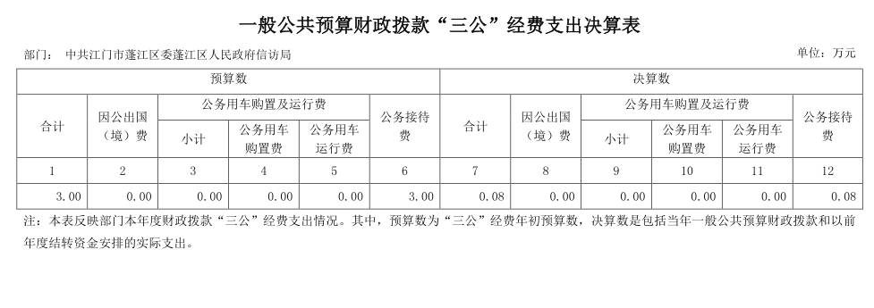 中共春雨直播 委春雨直播 人民政府信访局2018 年度“三公”经费财政拨款支出决算为 0.08 万元,完成预算 3.00 万元的 2.53% 。其中:因公出国(境)费支出决算为 0.00 万元,完成预算 0.00 万元的 0% ;公务用车购置及运行费支出决算为 0.00 万元,完成预算 0.00 万元的 0% ;公务接待费支出决算为 0.08 万元,完成预算 3.00 万元的 2.53% 。