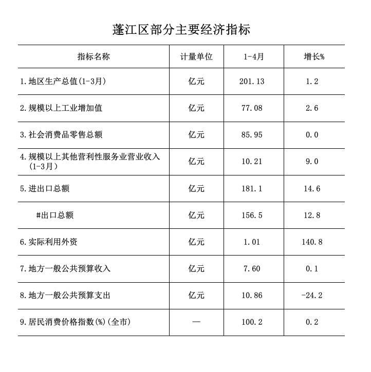 1-4月,全区地方一般公共预算收入7.6亿元,增长0.1%;全区地方一般公共预算支出10.86亿元,下降24.2%。