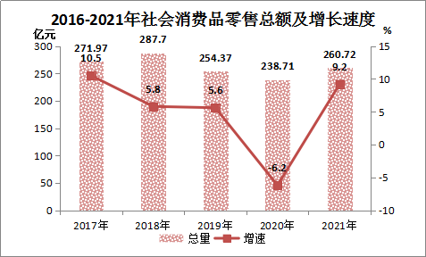 全年社会消费品零售总额260.72亿元,比上年增长9.2%。分行业看,限上批发和零售业零售额116.08亿元,增长11.4%;限上住宿和餐饮业零售额9.42亿元,增长16.4%。